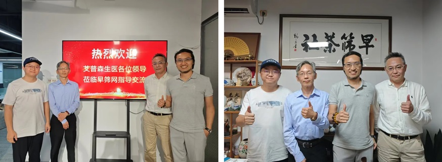 早篩網訊:近日,艾普森生醫創辦人呂長益博士、行政總監高榮華、商務長蘇崧學到訪早篩網參觀交流,與早篩網創始人& CEO 陳讚泉先生圍繞癌症基因甲基化應用、癌症早篩行業發展等話題進行深入討論。